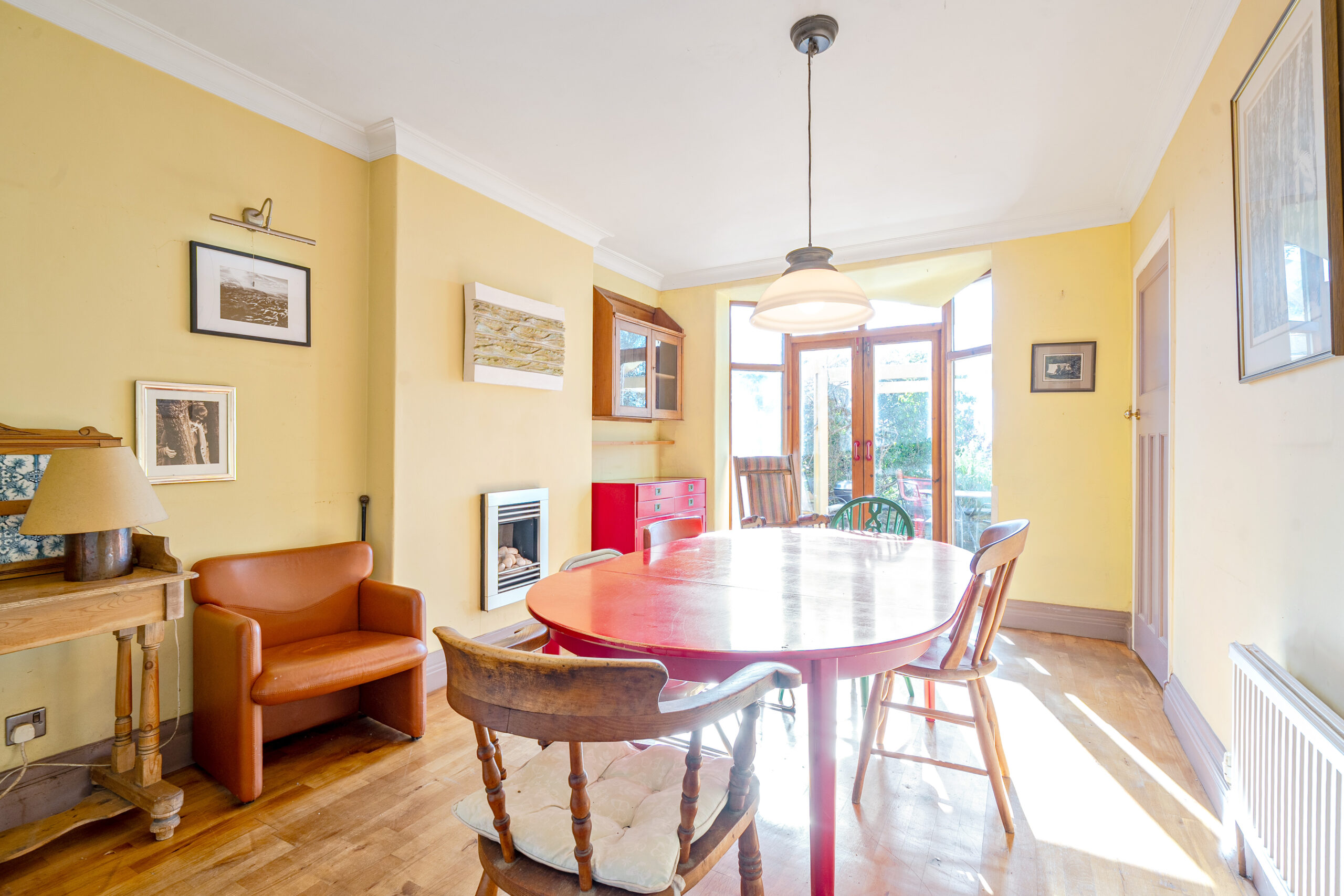 The striking facade of this family home is punctuated by original features, such as the central staircase and inner entrance door, serving as a nod to its historical roots. The extended living space boasts a sunroom at the front elevation, inviting natural light to dance across the room, while a cosy log burning stove sets a warm ambience perfect for relaxing evenings. Entertain guests in the formal dining area with French door access to the front terrace, or gather the family in the spacious kitchen diner designed for both functionality and comfort.