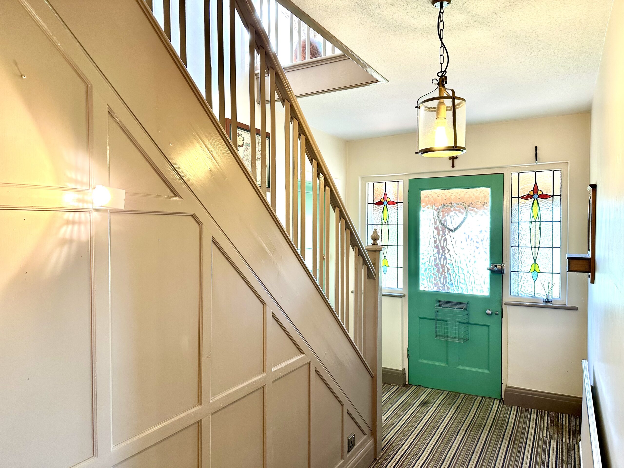 Front internal entry porch. Doubled glazed glass entry door with double panelled windows to either side. Leading you to the inner hallway, space benefits from an original 1930's door with stained glass windows to either side.