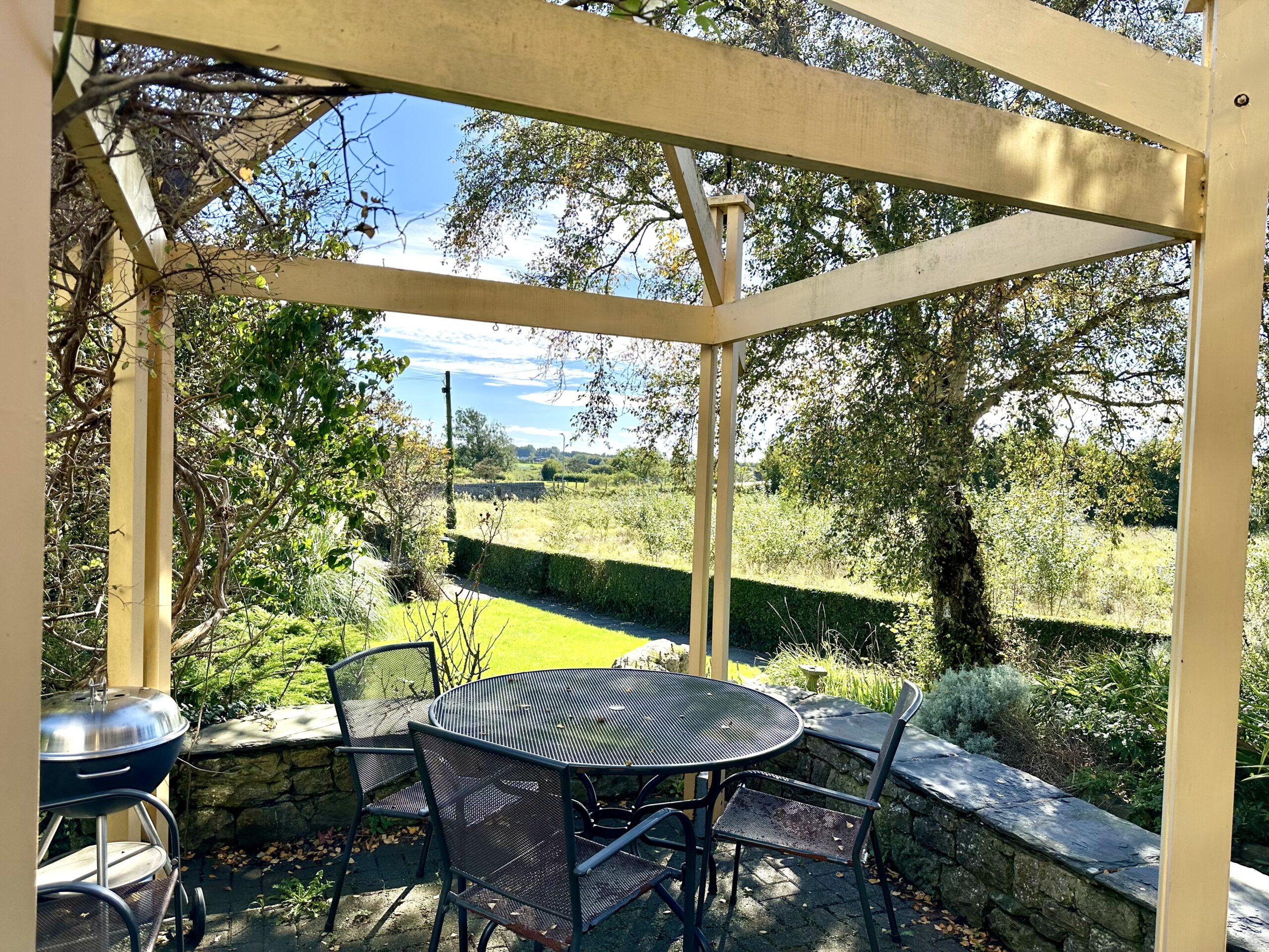 The dining space is open via a breakfast bar in the kitchen dining room, offering a great space for entertaining, formal dining or second main reception. Fitted with wooden floors, an inset fire, set into the chimney breast and double doors leading to the front terrace with pergola.