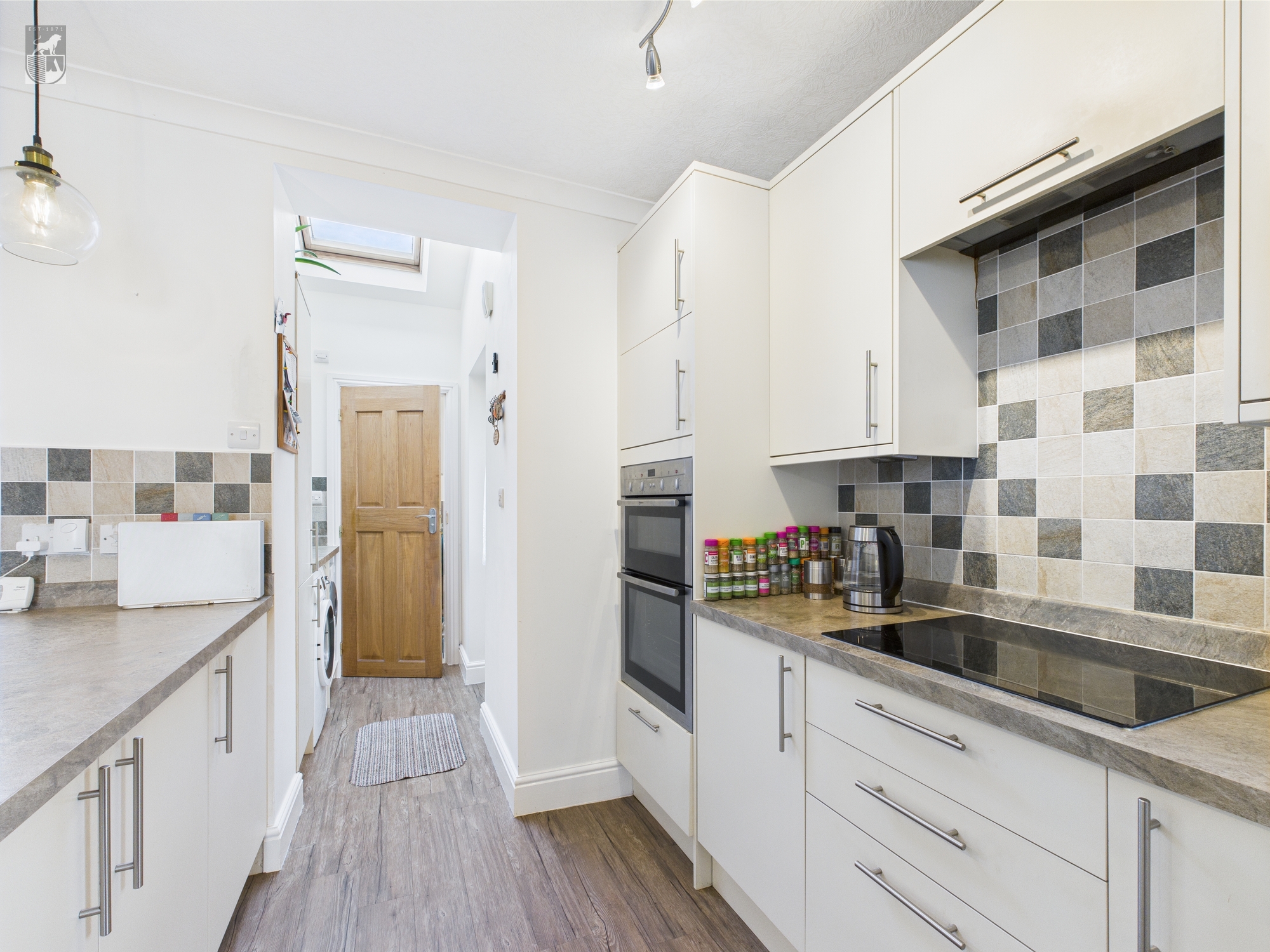 The kitchen area has an abundance of units, space and plumbing for a washing machine, tumble dryer and dishwasher. There is a Neff electric hob and a built-in oven. Doors lead to the WC, understairs cupboard and outside.