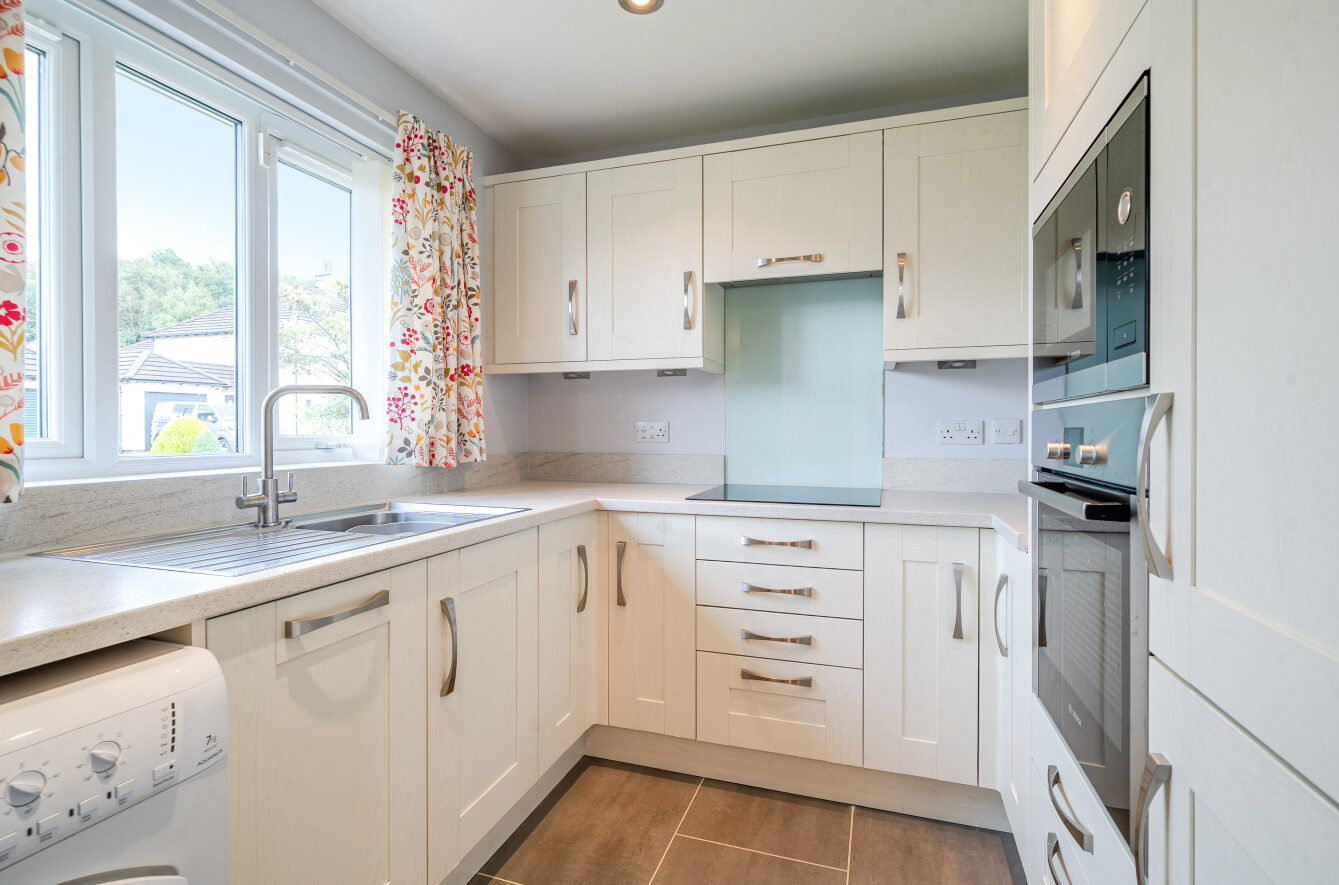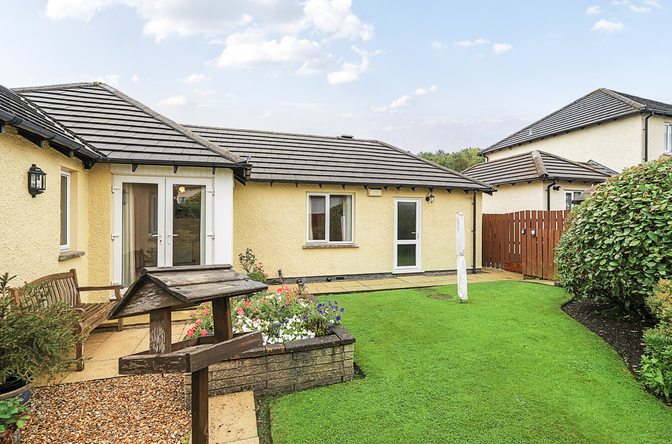 This impressive detached bungalow offers two bedrooms, a modern bathroom and a separate WC providing comfortable and flexible living. The heart of the home is a generous open-plan living area, featuring a cosy fireplace and abundant natural light from large windows and French doors that open directly onto the landscaped garden. The contemporary kitchen boasts sleek units, integrated appliances, and ample countertop space, making it ideal for both every-day living and entertaining. The property is finished in a neutral decor throughout, with plush carpeting and built-in storage adding warmth and practicality.