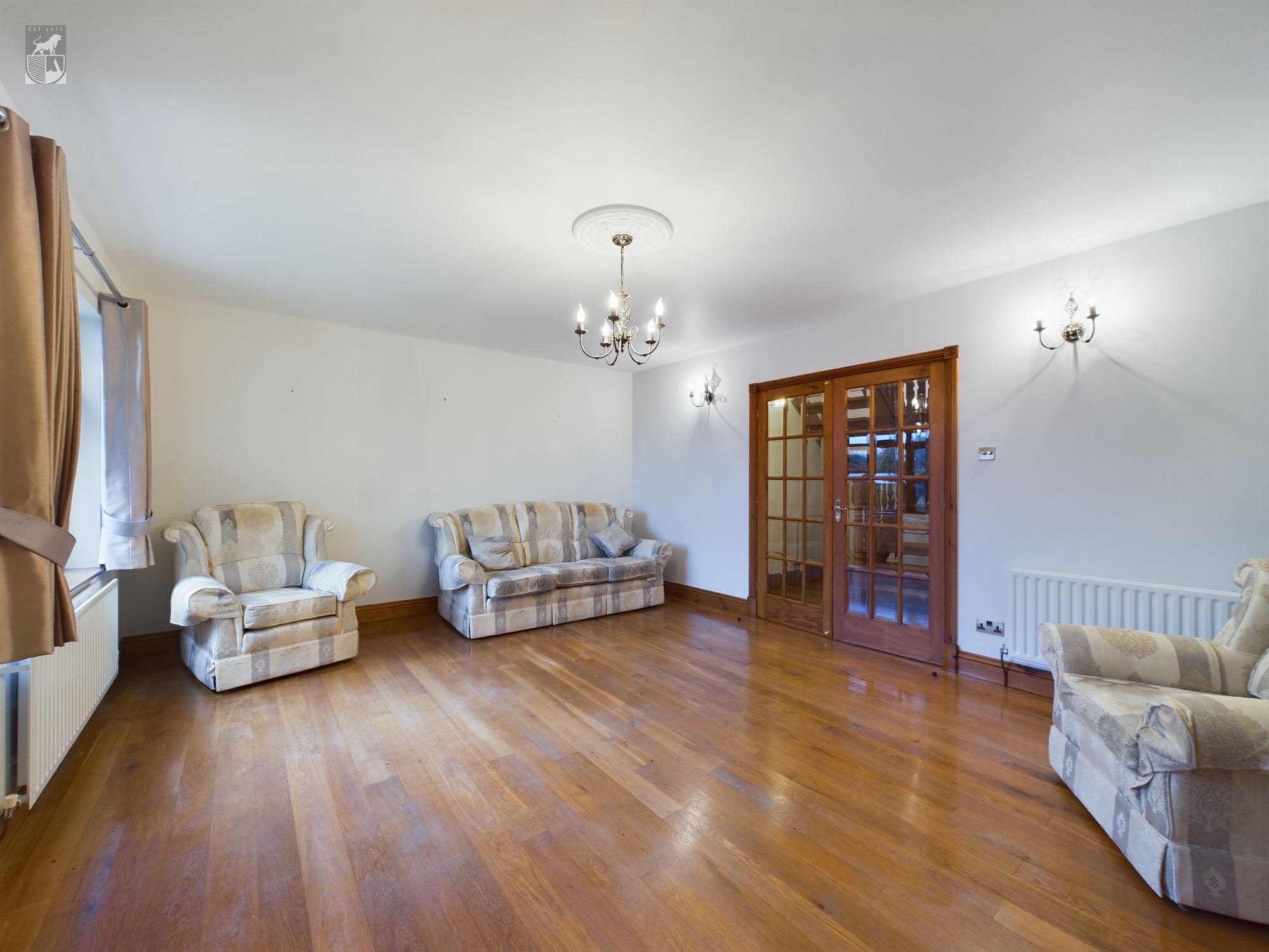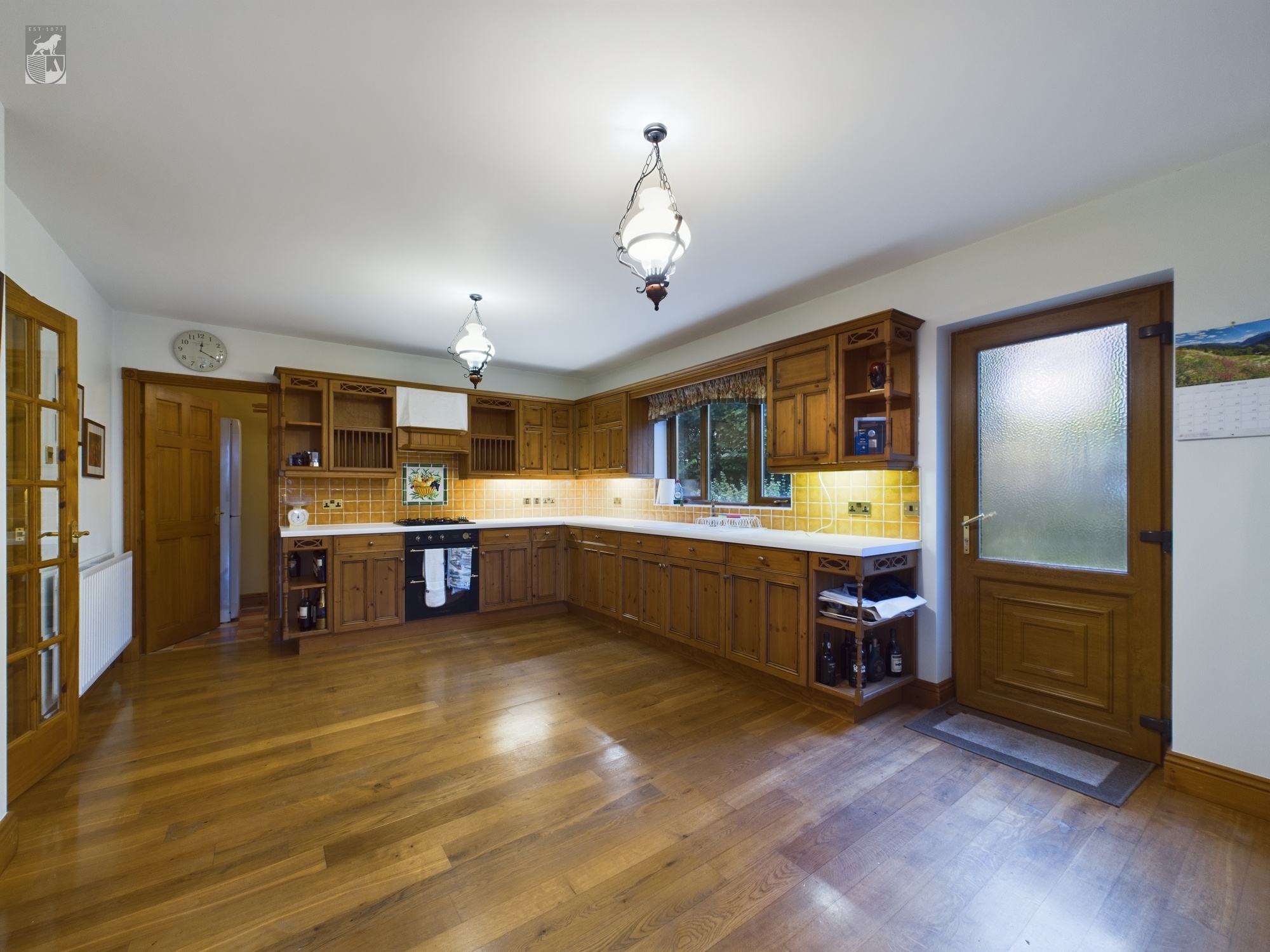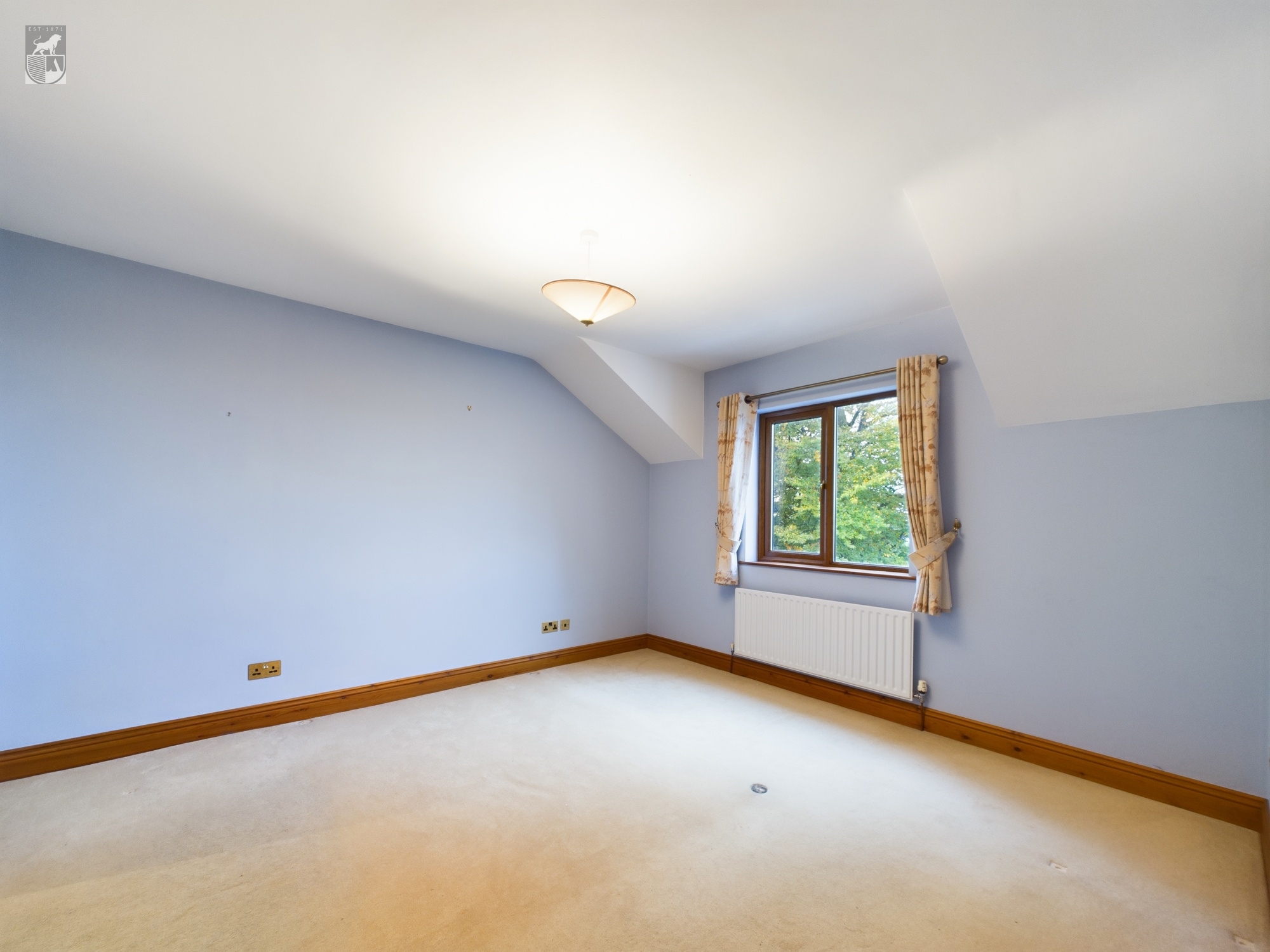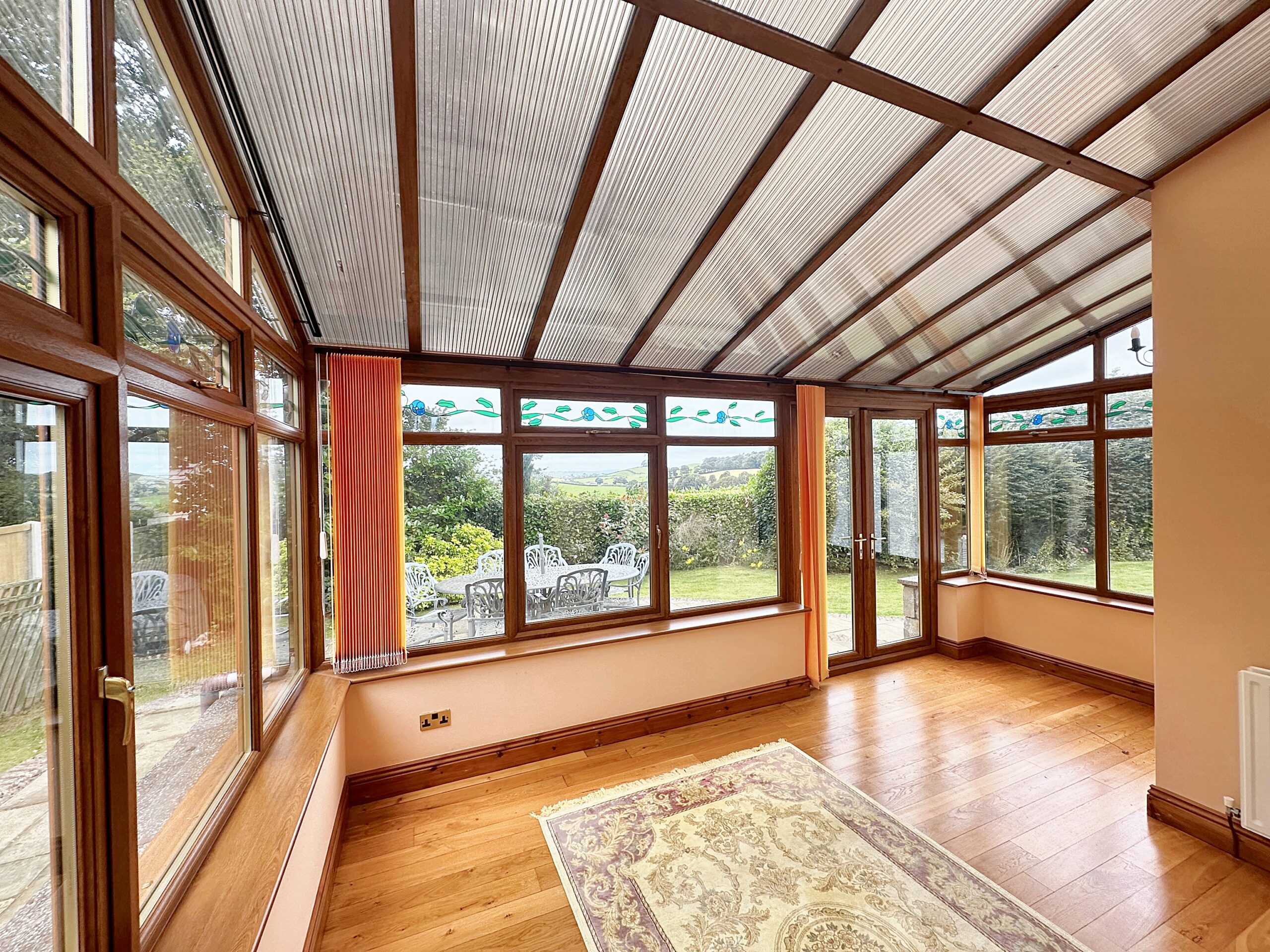 The Conservatory boasts an oak floor with feature stain glass windows, it overlooks the garden with fantastic views. The room is equipped with a radiator, ariel point, and wall lights.