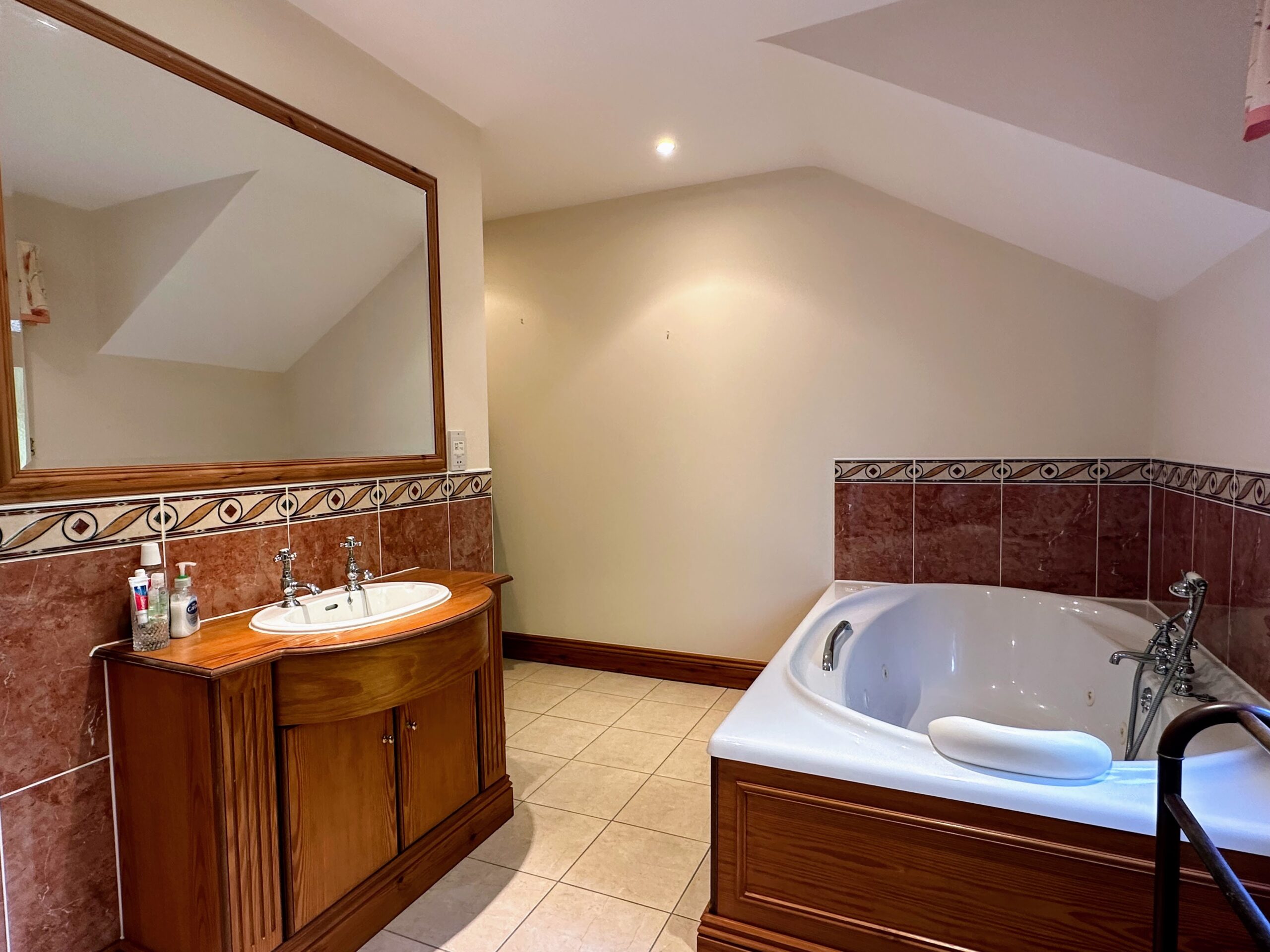 Spacious Bathroom, with Jaccuzi bath and seperate walk in shower. W/C, Vanity wash hand basin and large frosted glass window to rear. Decorative tiles.