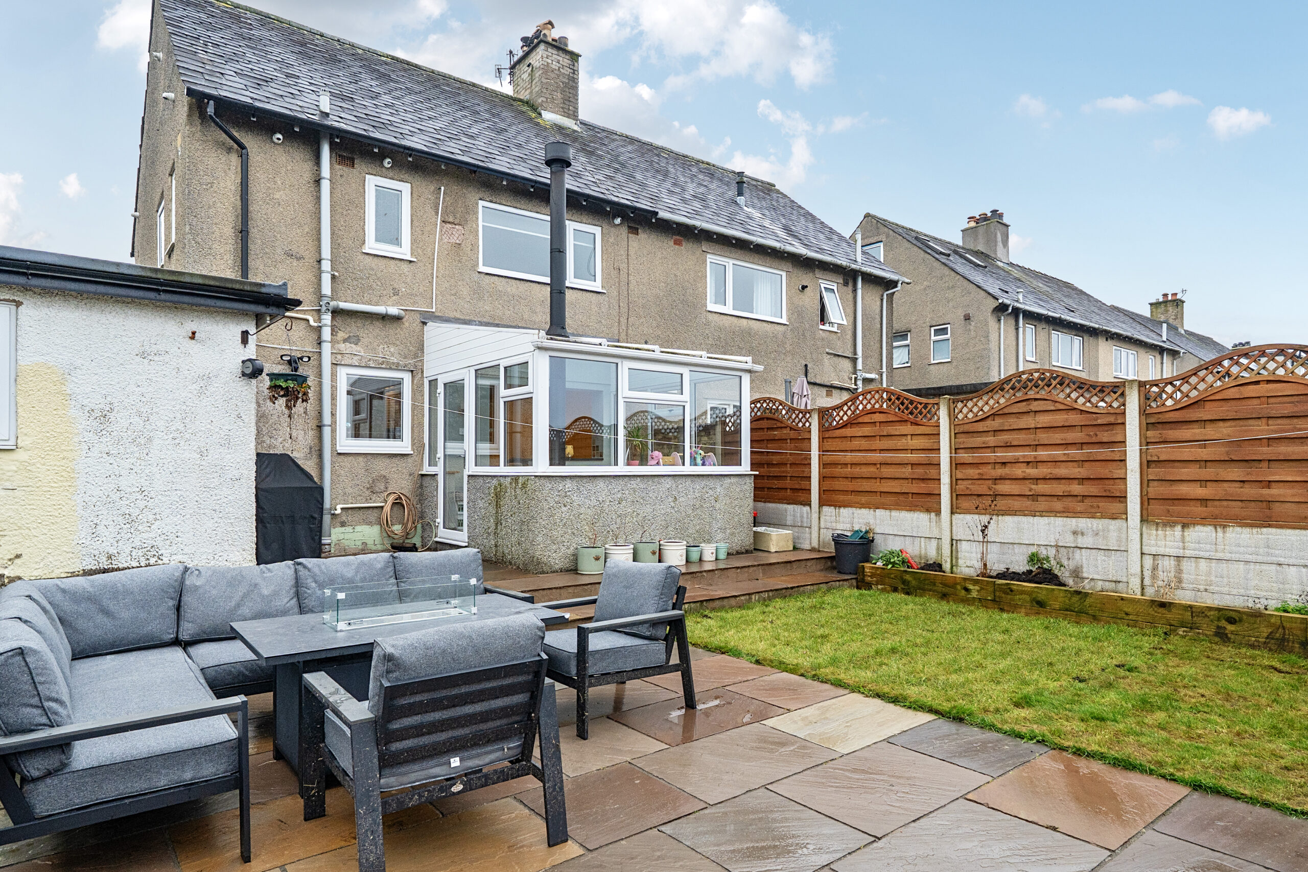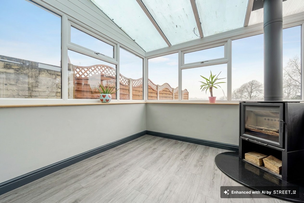 The main reception room features a large window for abundant natural light, and a cosy fireplace, creating the perfect setting for relaxation. A second living space in the conservatory showcases a charming wood-burning stove deal for both entertaining and quiet evenings. Upstairs are three well-appointed bedrooms and a modern family bathroom.