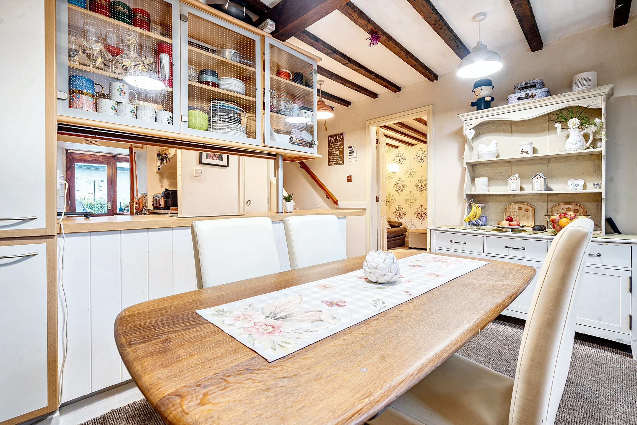 This multi functional space offers a fitted kitchen and dining area, separated by a breakfast bar. Neutral pastel tones with wooden feature beams, the main front entrance doorway is located here, the room benefits from an open staircase to the first floor, creating an open plan feel.