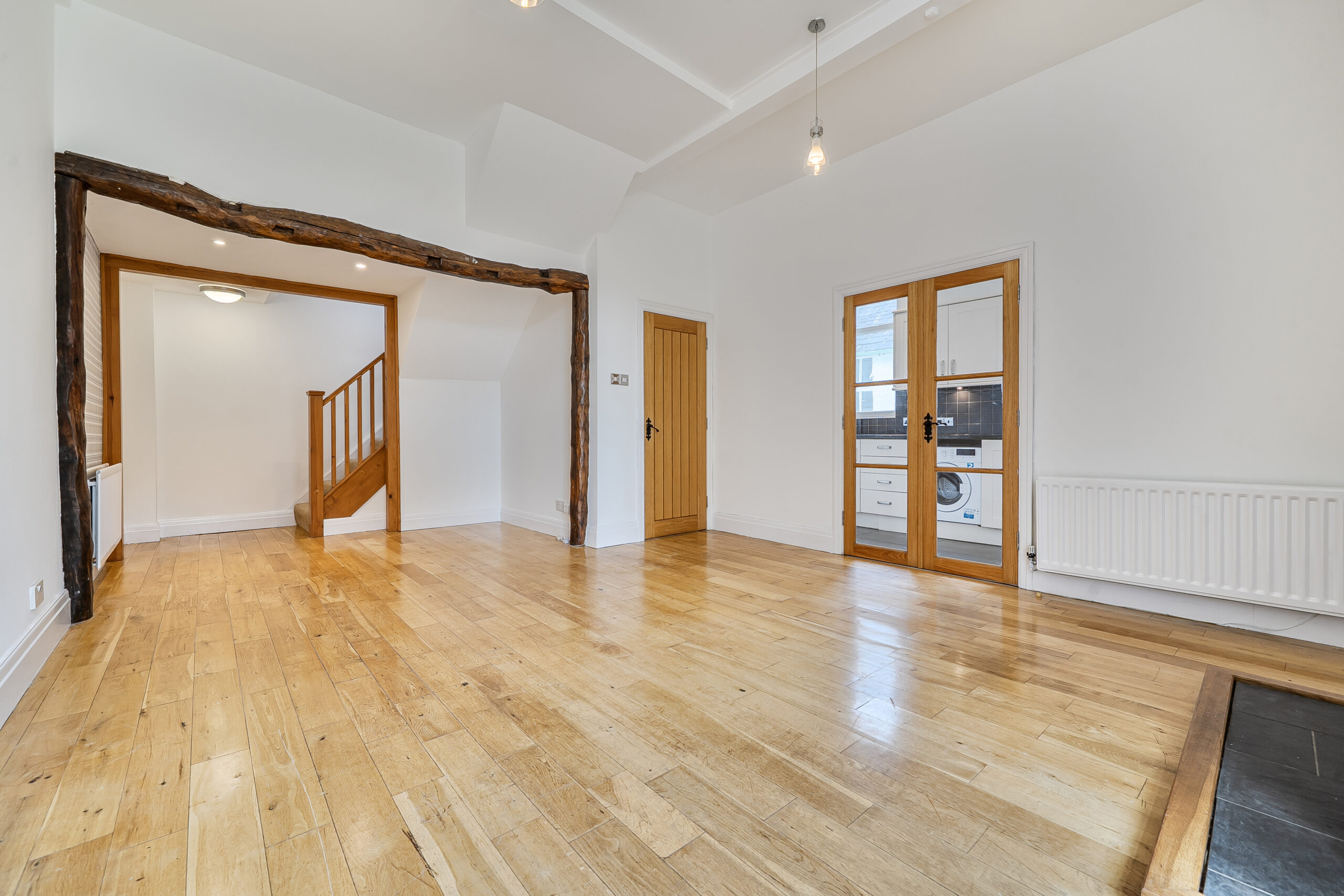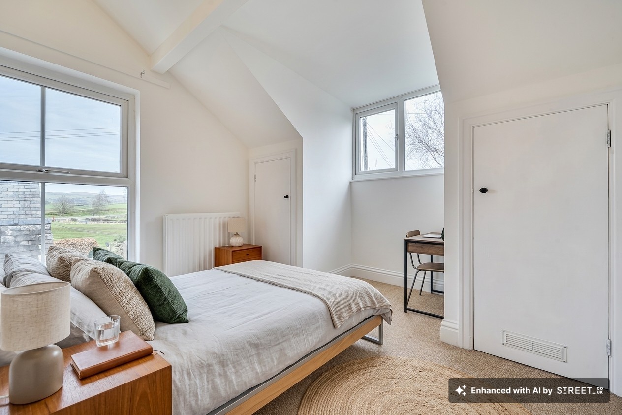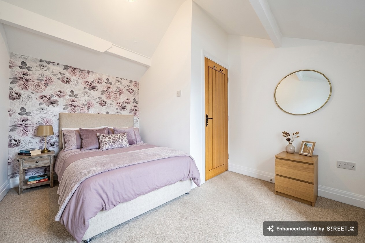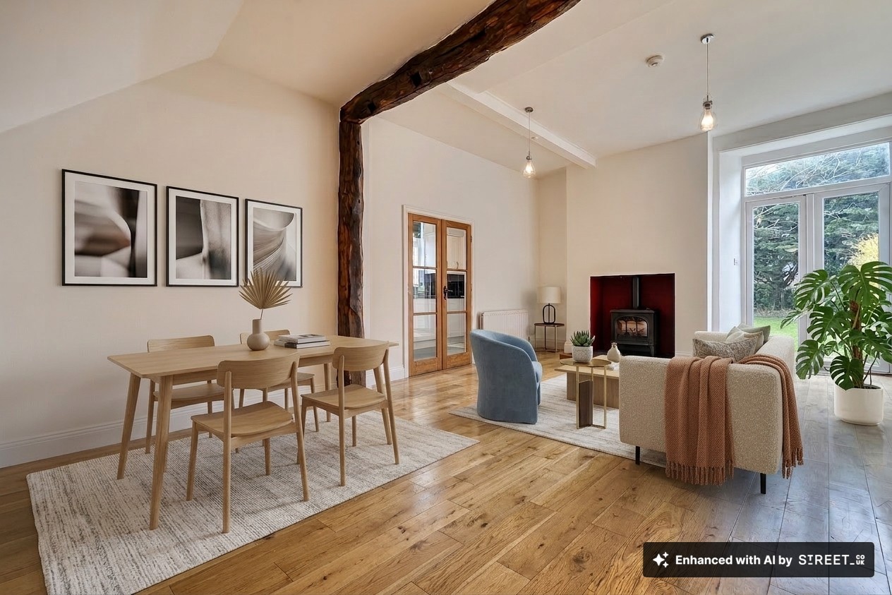 This stunning three-bedroom, two-bathroom semi-detached house showcases an exceptional blend of period charm and contemporary living. The property unfolds across a series of bright, inviting spaces, beginning with a spacious open-plan living area featuring beautiful hardwood flooring, exposed wooden beams and feature gas stove. French doors and large windows flood the room with natural light and offer seamless access to the expansive garden, creating an effortless indoor-outdoor lifestyle. The modern kitchen is equipped with sleek cabinetry, integrated appliances (including a built-in oven, washing machine and dishwasher), and a stylish black tiled backsplash. Ample natural light pours in through a large window, making this space both functional and welcoming. The home’s three bedrooms are each thoughtfully designed with neutral decor, plush carpeted flooring and large windows framing picturesque countryside views.