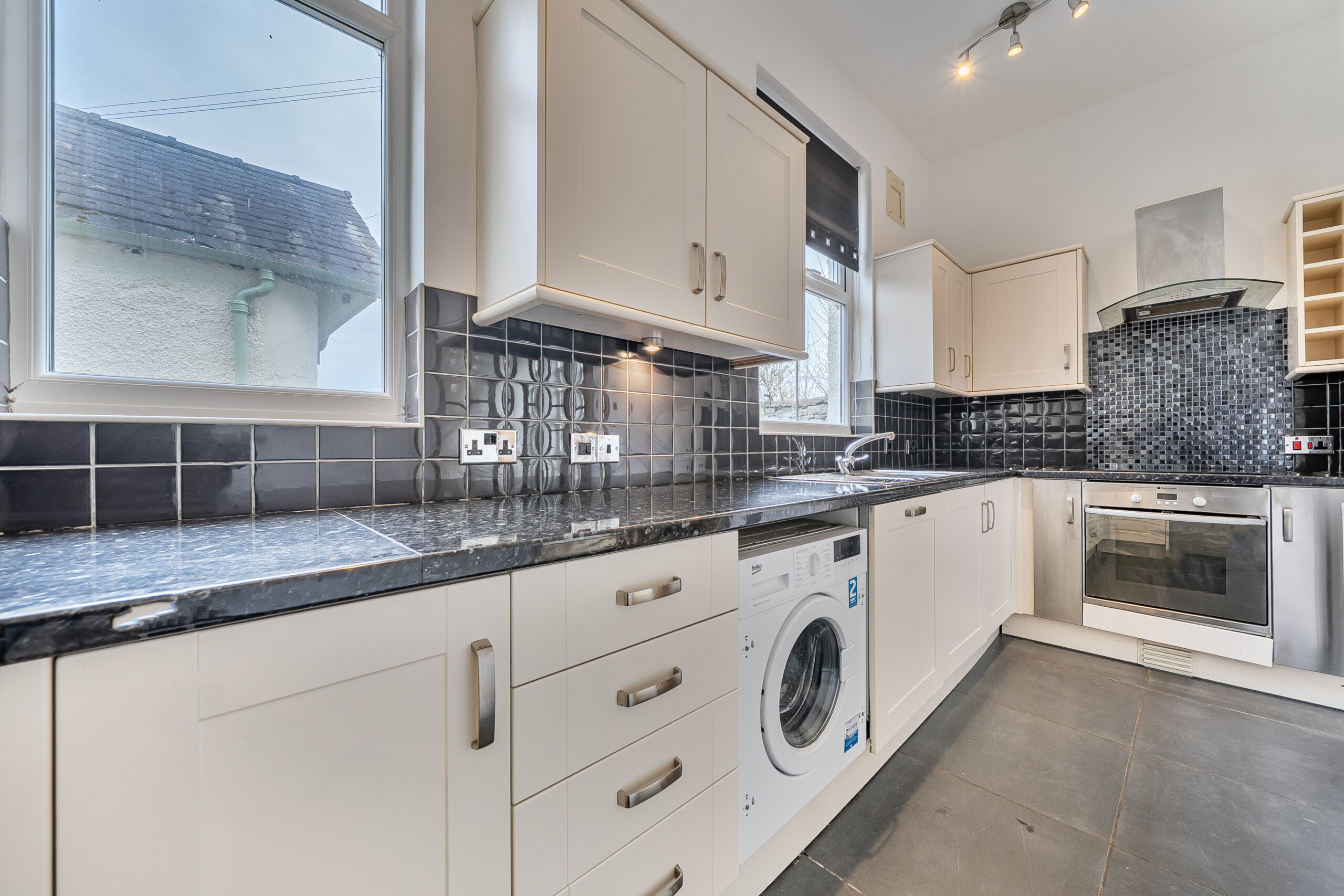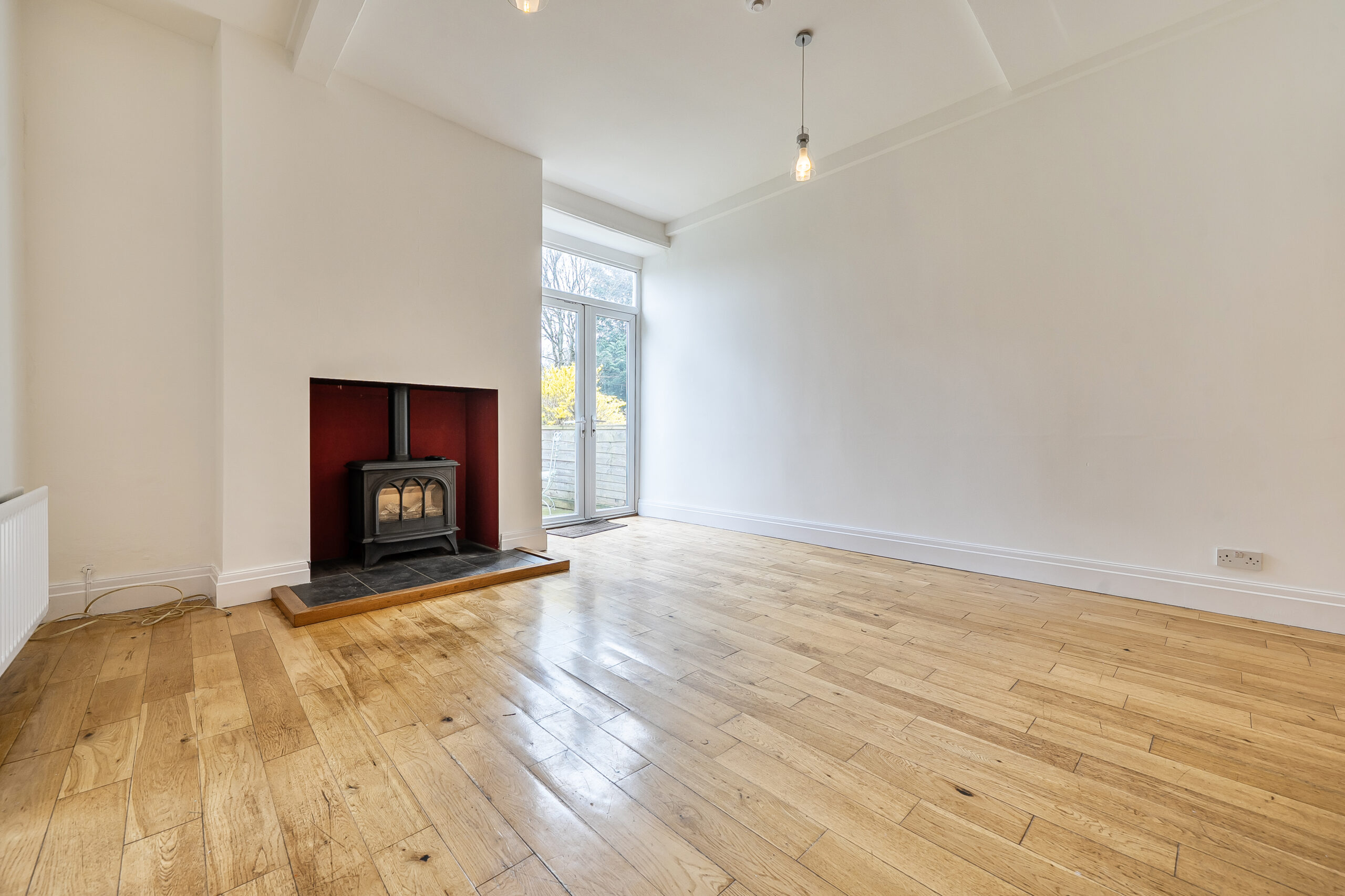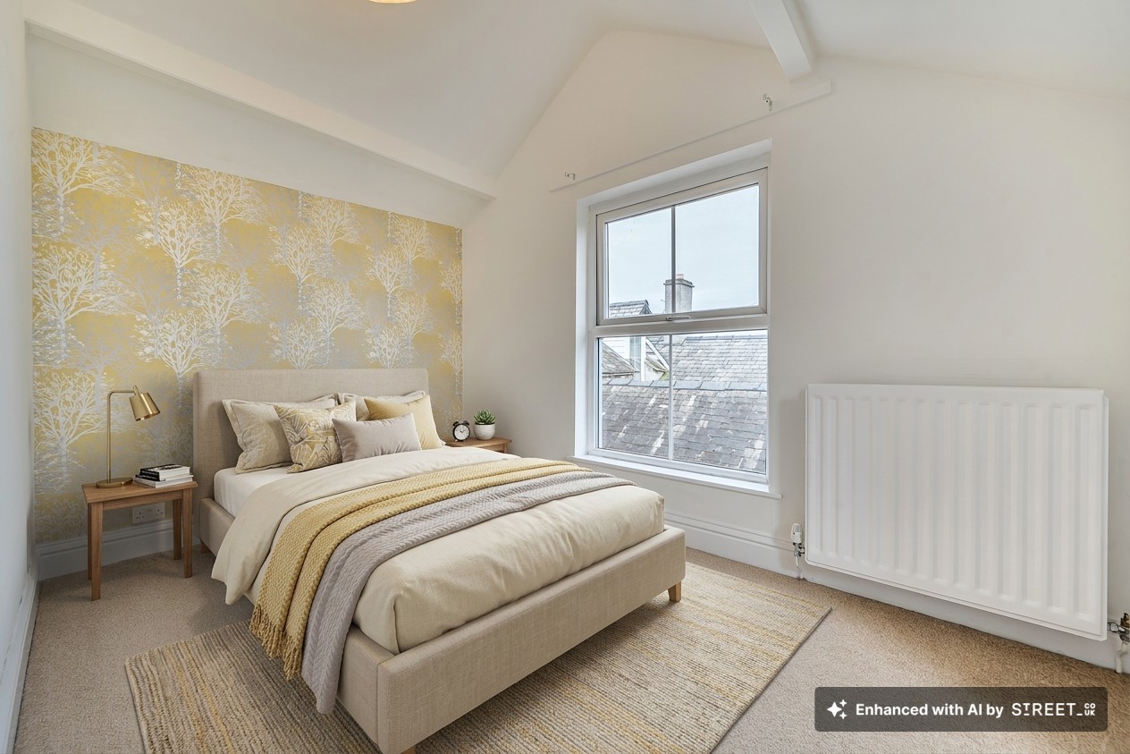 This stunning three-bedroom, two-bathroom semi-detached house showcases an exceptional blend of period charm and contemporary living. The property unfolds across a series of bright, inviting spaces, beginning with a spacious open-plan living area featuring beautiful hardwood flooring, exposed wooden beams and feature gas stove. French doors and large windows flood the room with natural light and offer seamless access to the expansive garden, creating an effortless indoor-outdoor lifestyle. The modern kitchen is equipped with sleek cabinetry, integrated appliances (including a built-in oven, washing machine and dishwasher), and a stylish black tiled backsplash. Ample natural light pours in through a large window, making this space both functional and welcoming. The home’s three bedrooms are each thoughtfully designed with neutral decor, plush carpeted flooring and large windows framing picturesque countryside views.