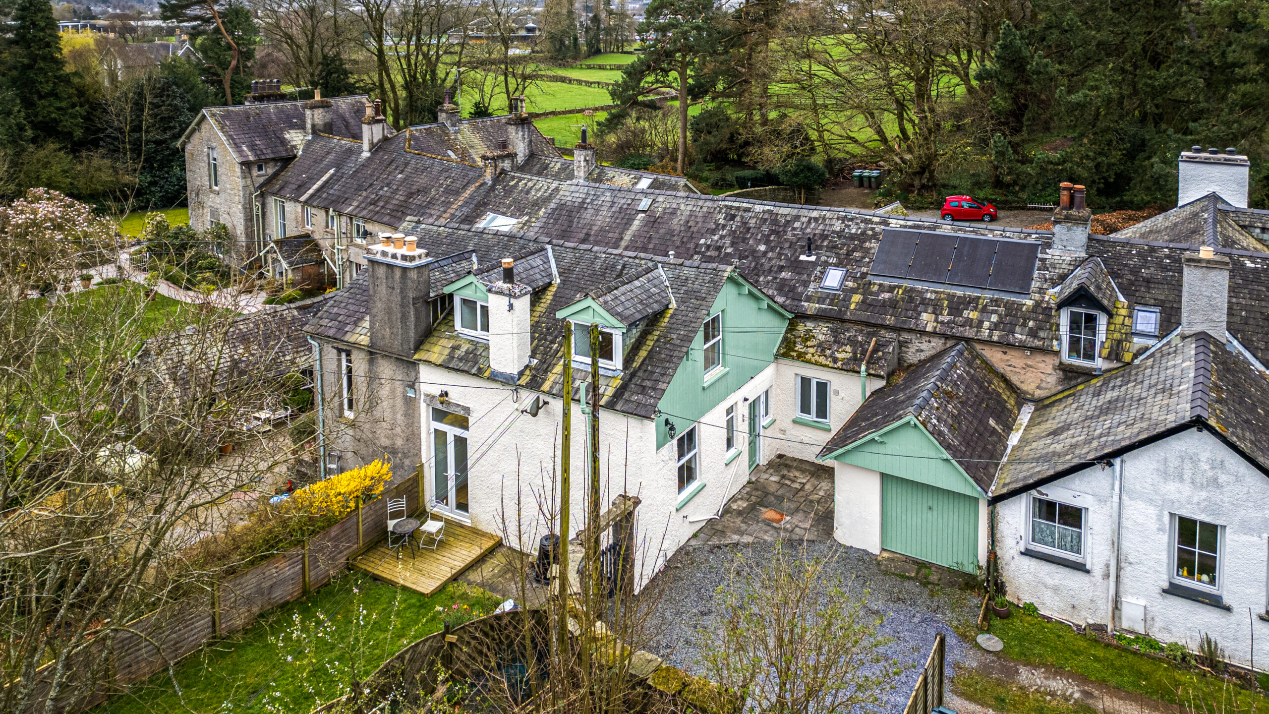 The property’s exterior is equally impressive, boasting large gardens multiple outdoor seating areas, including a decked terrace provide ideal spots for relaxation or entertaining guests. The house is enhanced by off-road parking, including a gravel driveway and an attached garage. Period details add character throughout, while contemporary touches such as modern bathrooms (with walk-in shower, illuminated mirror, sleek tiling, and a bath-tub with shower) ensure comfort and style. The property’s gardens create a peaceful retreat, perfect for families, gardeners, or those seeking a serene countryside lifestyle. This home promises a rare opportunity to enjoy spacious, flexible living in a tranquil rural setting on the outskirts of Kendal. No chain.