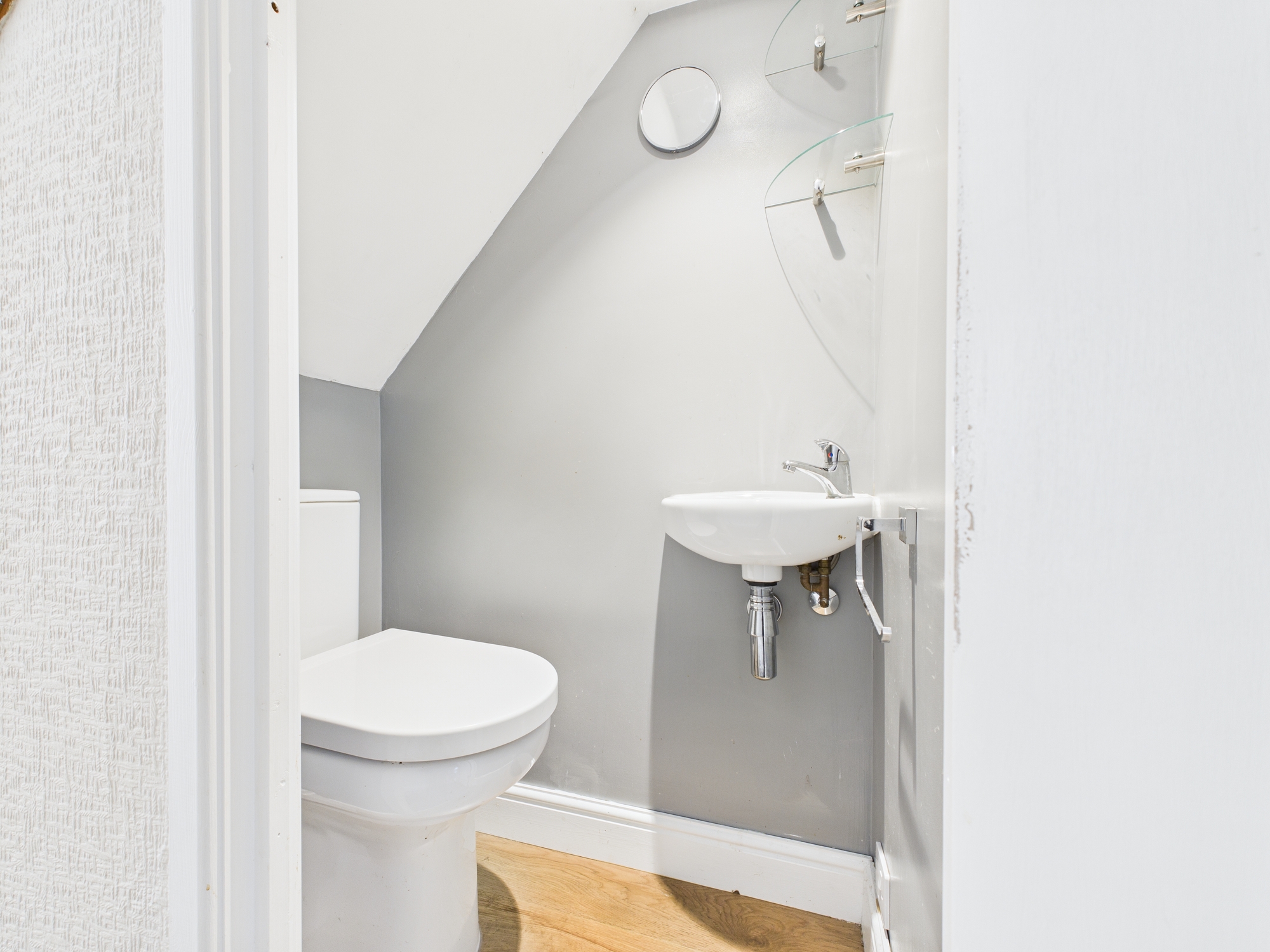 Under stairs WC has glass shelving and small wash hand basin.