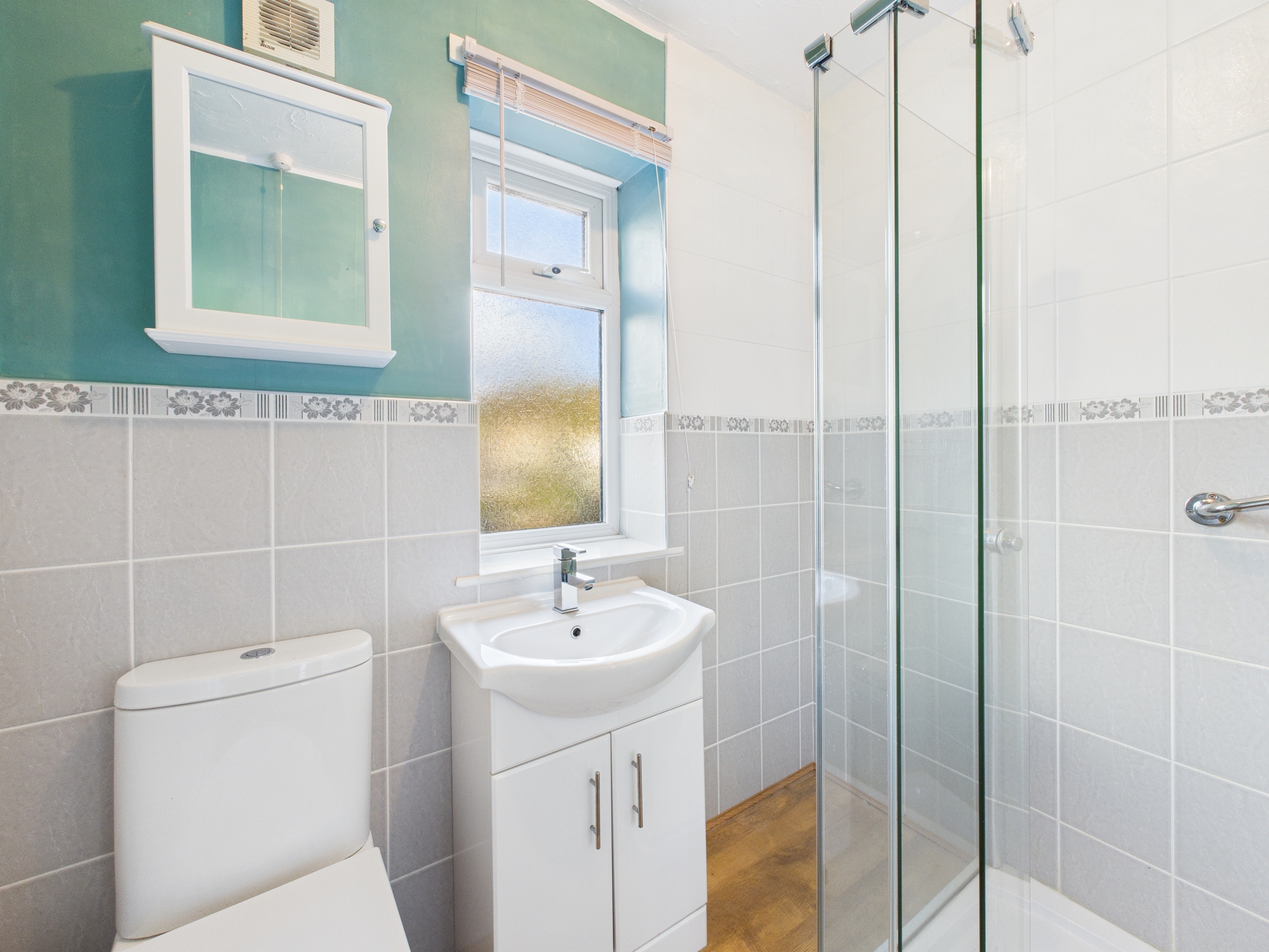 The shower room has a Aqua electric shower, vanity wash hand basin and WC.