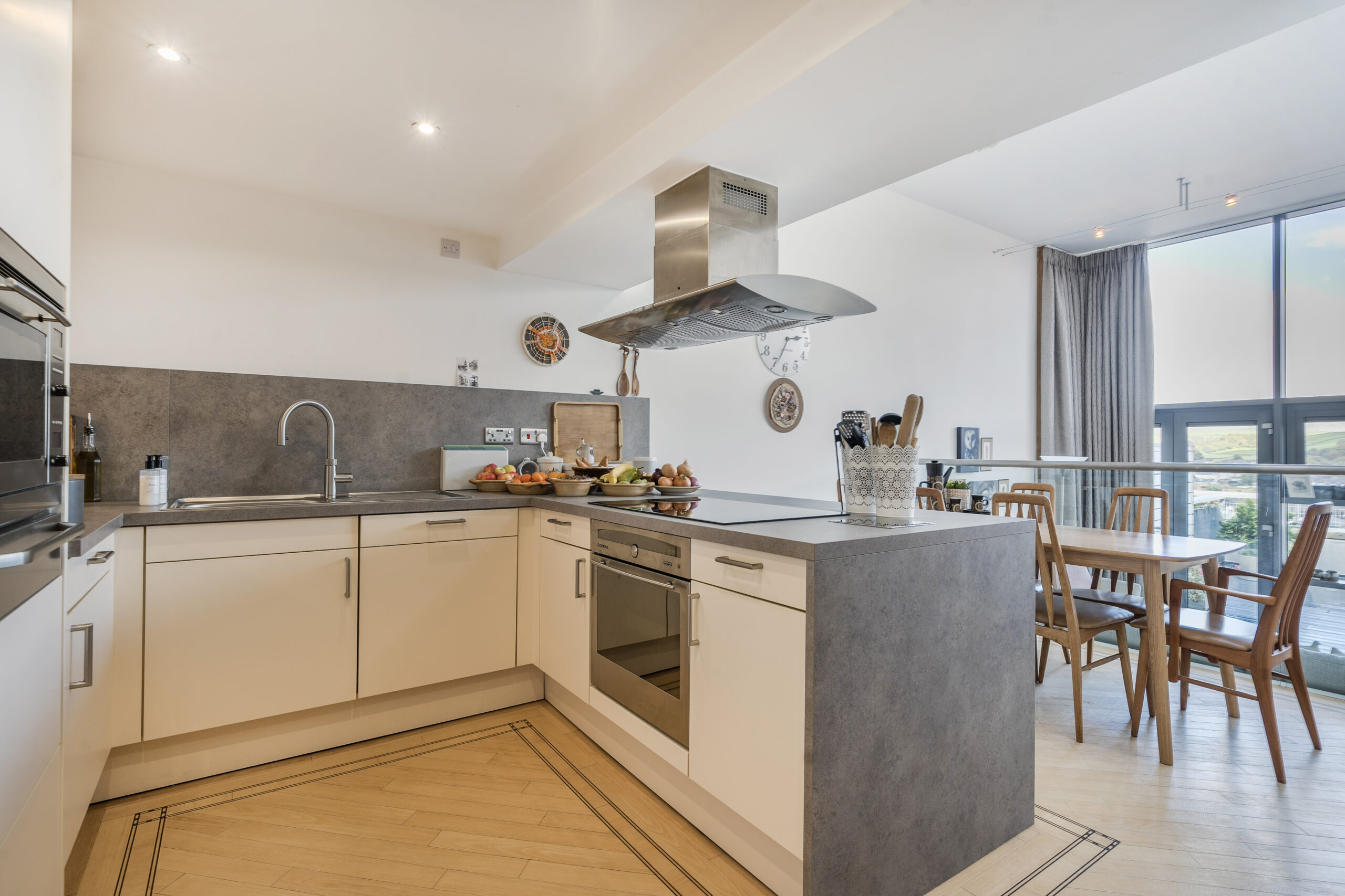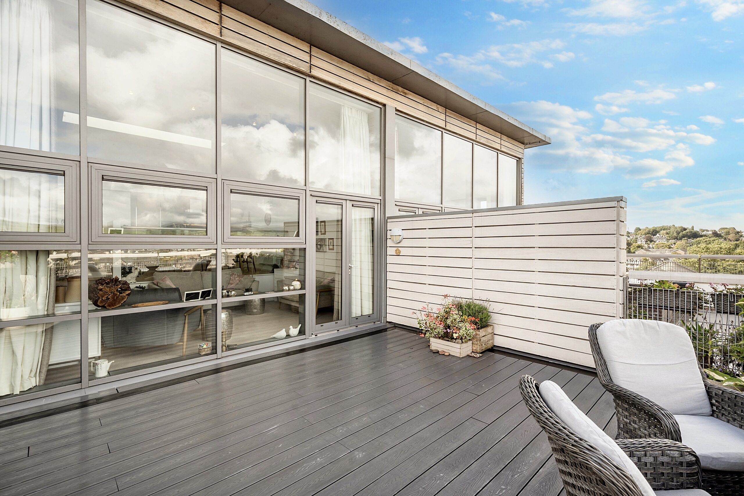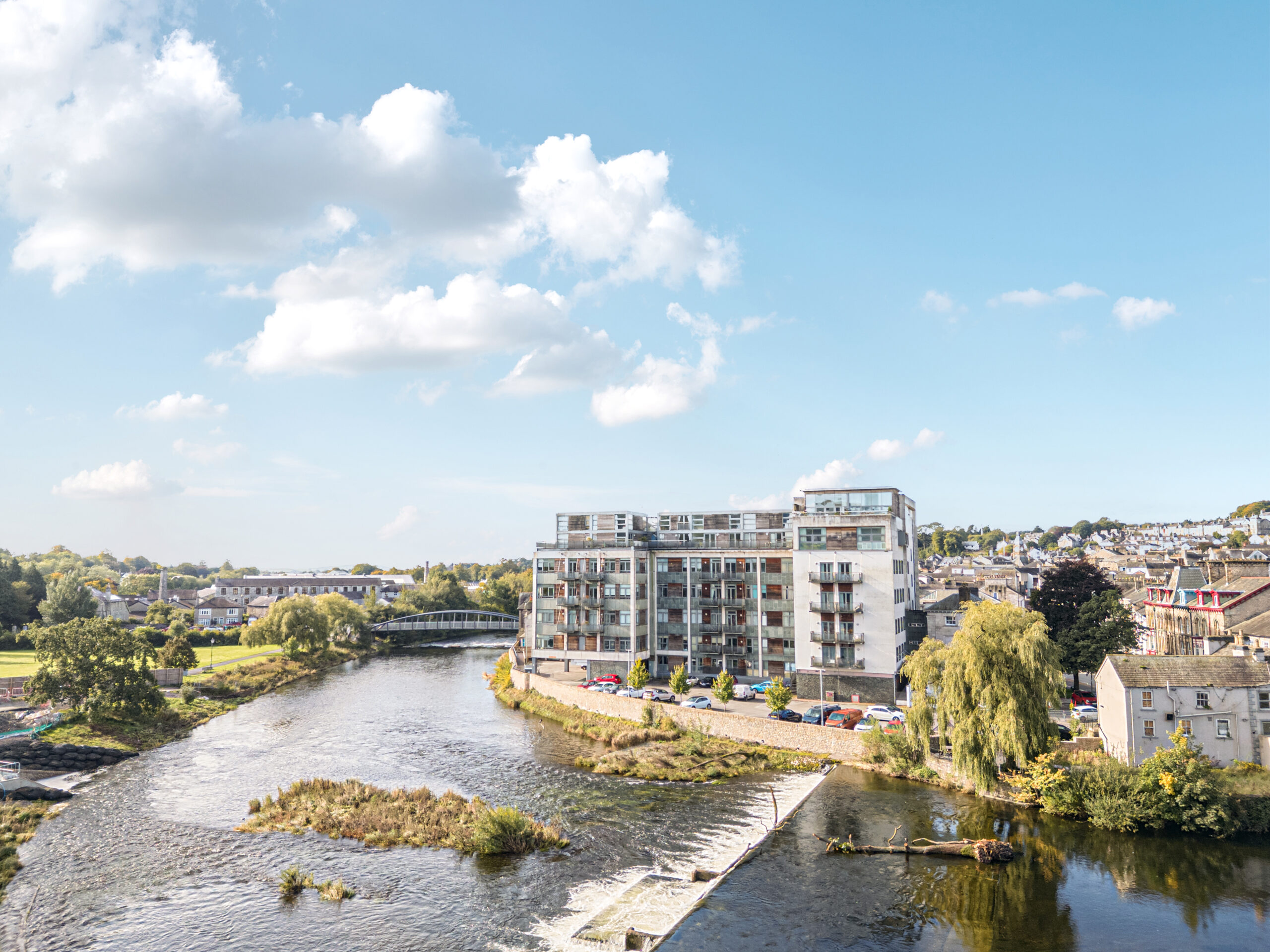 Executive fifth-floor two-bedroom penthouse apartment boasting a private rooftop terrace in the heart of town. This modern abode is laid out over two floors and features a sleek kitchen complete with an island and integrated appliances. Floor-to-ceiling windows bathe the open plan living and dining area in natural light while offering breathtaking views of the surrounding countryside. The property includes contemporary bathrooms with a walk-in shower and bath, ample built-in storage, and wardrobes for convenience. Residents can unwind on the private rooftop terrace, enjoying panoramic vistas of the river and lush landscapes. Allocated parking adds to the convenience of this luxurious urban retreat.