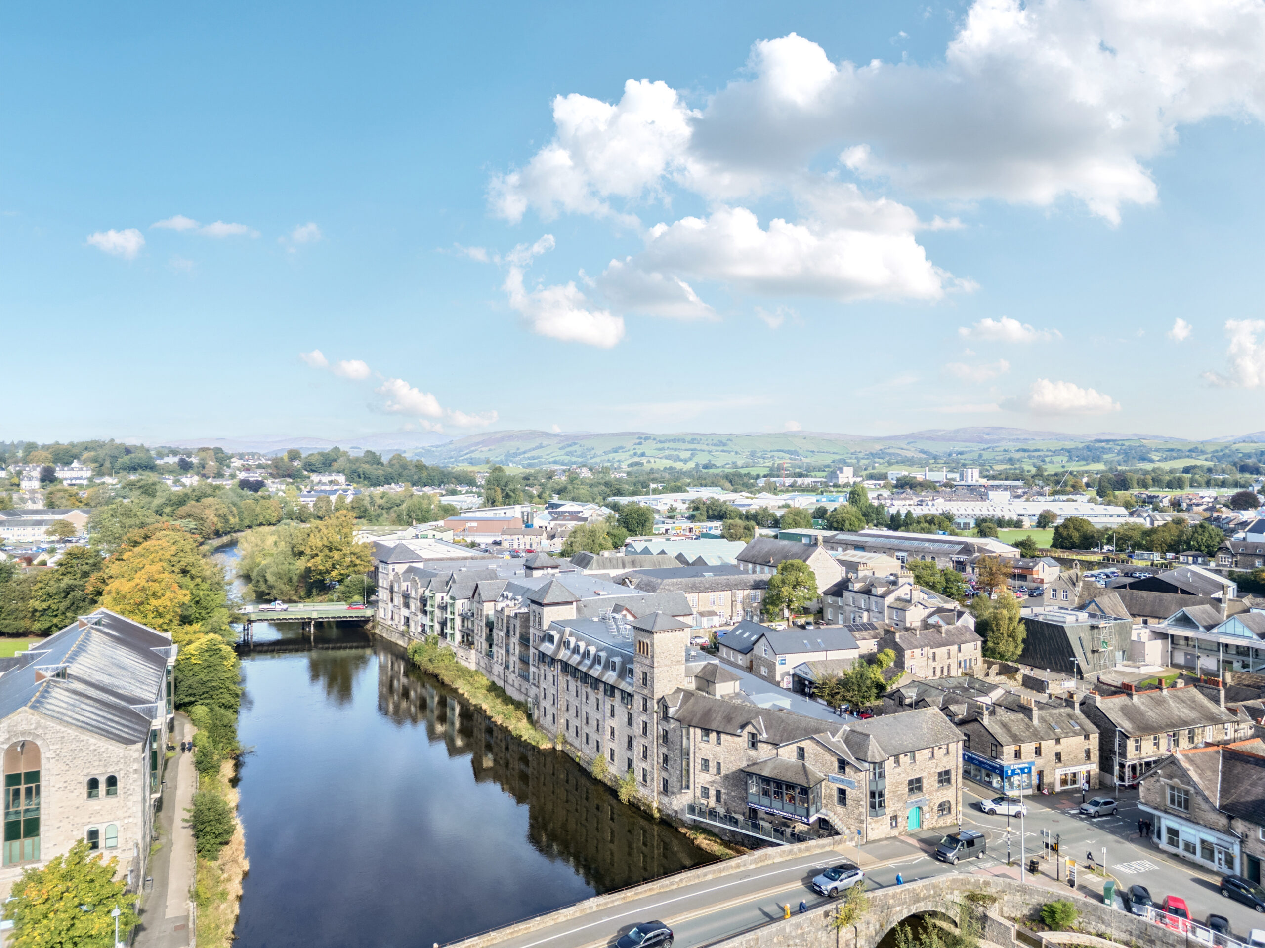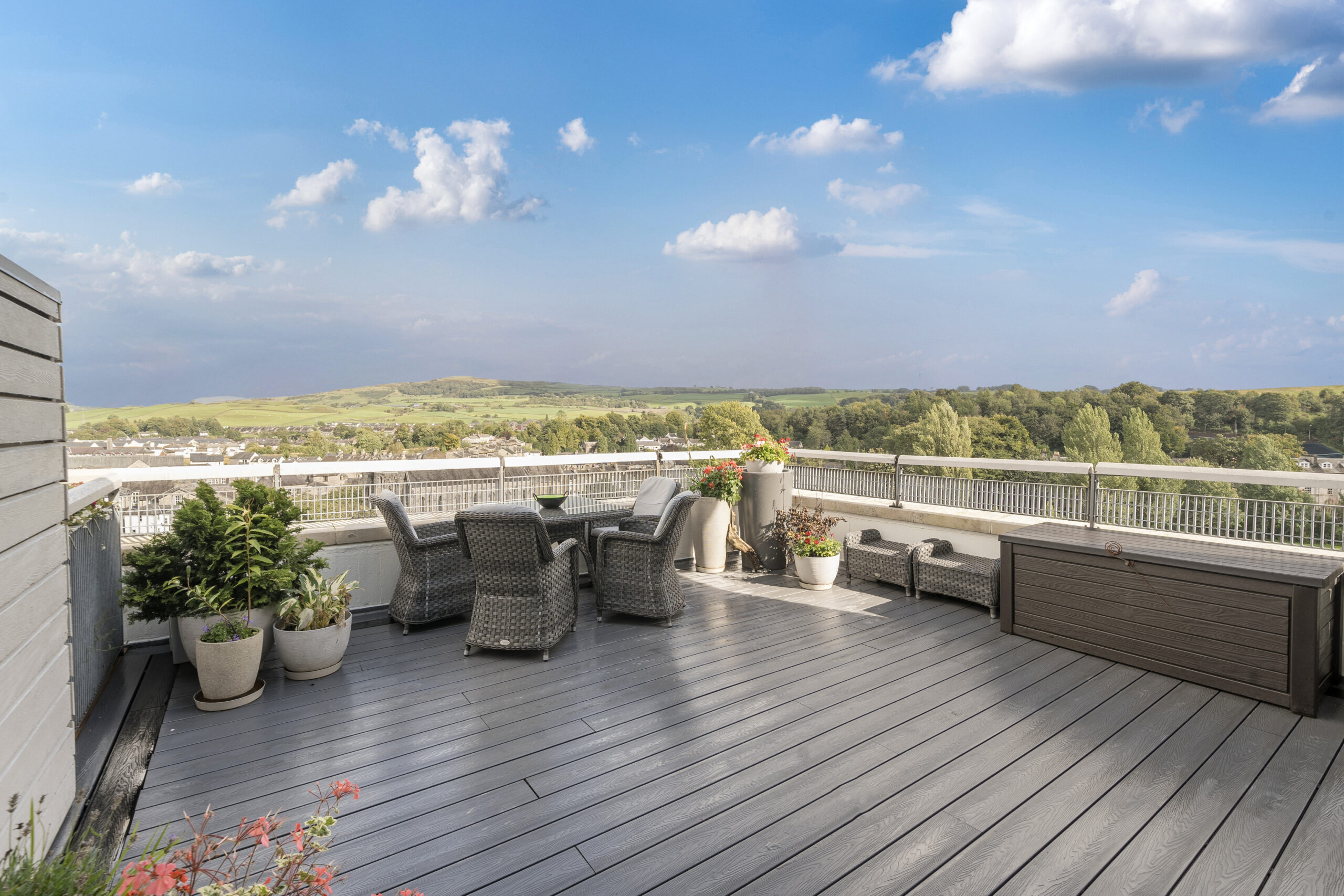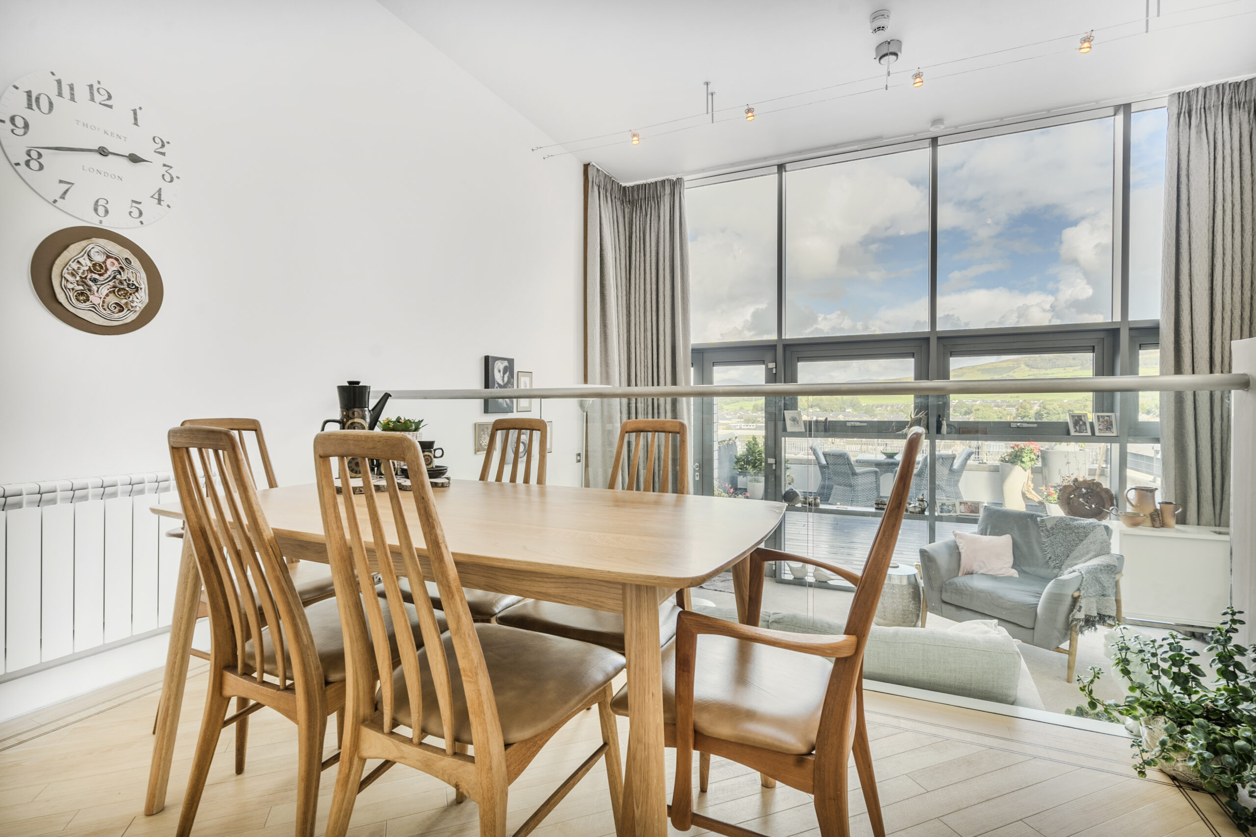 Executive fifth-floor two-bedroom penthouse apartment boasting a private rooftop terrace in the heart of town. This modern abode is laid out over two floors and features a sleek kitchen complete with an island and integrated appliances. Floor-to-ceiling windows bathe the open plan living and dining area in natural light while offering breathtaking views of the surrounding countryside. The property includes contemporary bathrooms with a walk-in shower and bath, ample built-in storage, and wardrobes for convenience. Residents can unwind on the private rooftop terrace, enjoying panoramic vistas of the river and lush landscapes. Allocated parking adds to the convenience of this luxurious urban retreat.
